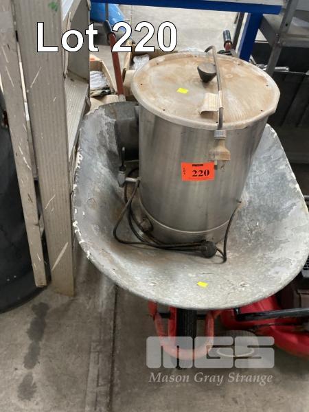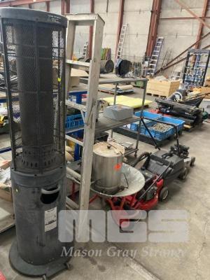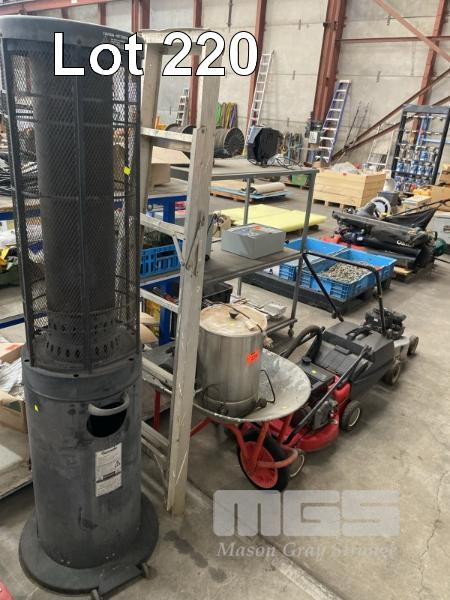 GASMATE PATIO HEATER, WHEELBARROW, ONGA POOL PUMP, HOT WATER URN & 2 x LAWNMOWERS, VICTA SABRE