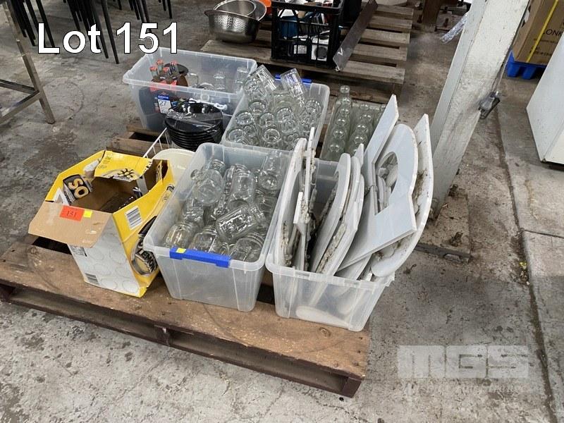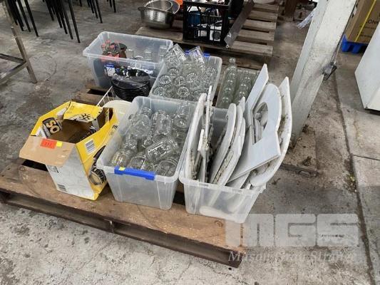 ASSORTED GLASSWARE, PLATES, SIGNAGE, ETC