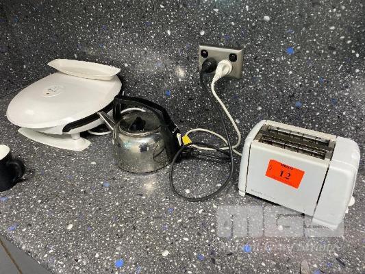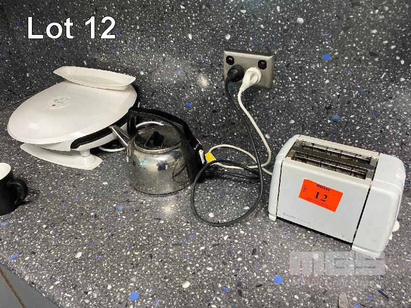 TOASTER, SANDWICH PRESS, KETTLE, PLATES, CUPS, ETC