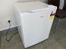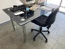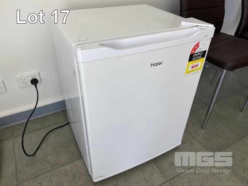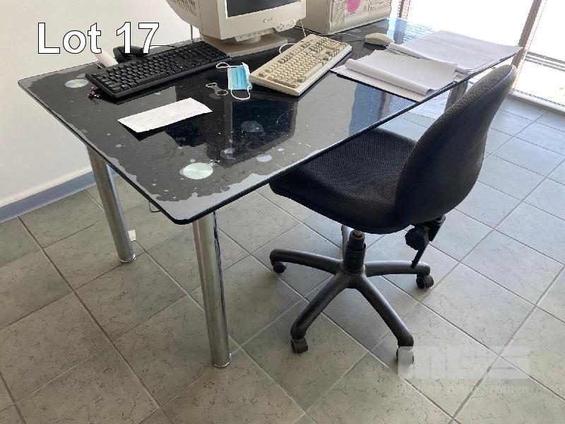 4 x VISITORS CHAIRS, VINYL & CHROME FRAME, 1500 x 900mm, GLASS TOP CHROME LEG TABLE, GAS LIFT OFFICE CHAIR & HAIER BAR FRIDGE