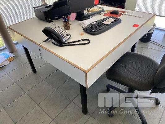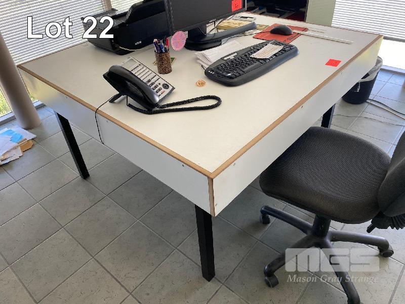 LARGE LAMINATE DESK, WHITE, 1340 x 1340mm, GAS LIFT OFFICE CHAIR, 2 x CLOTH VISITORS CHAIRS & SIDE STORAGE SHELF, 2 TIER