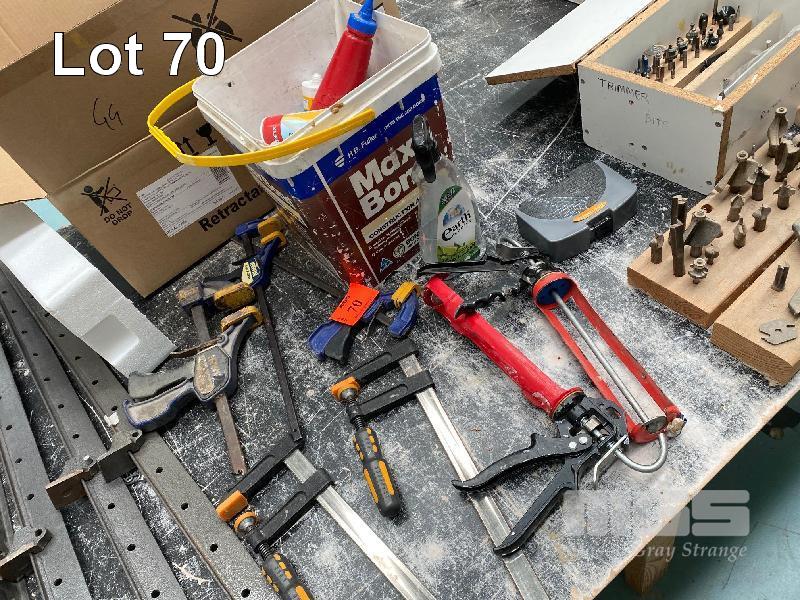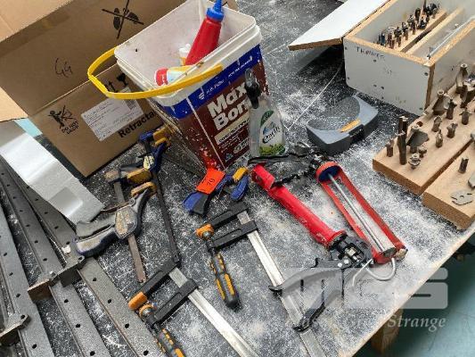 2 x F-CLAMPS, 3 x IRWIN QUICK ACTION CLAMPS, 2 x APPLICATOR GUNS & VARIOUS SEALANTS