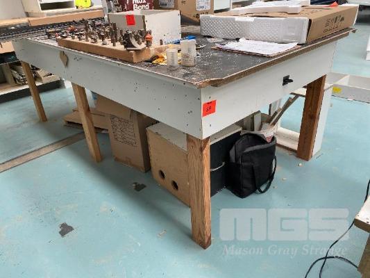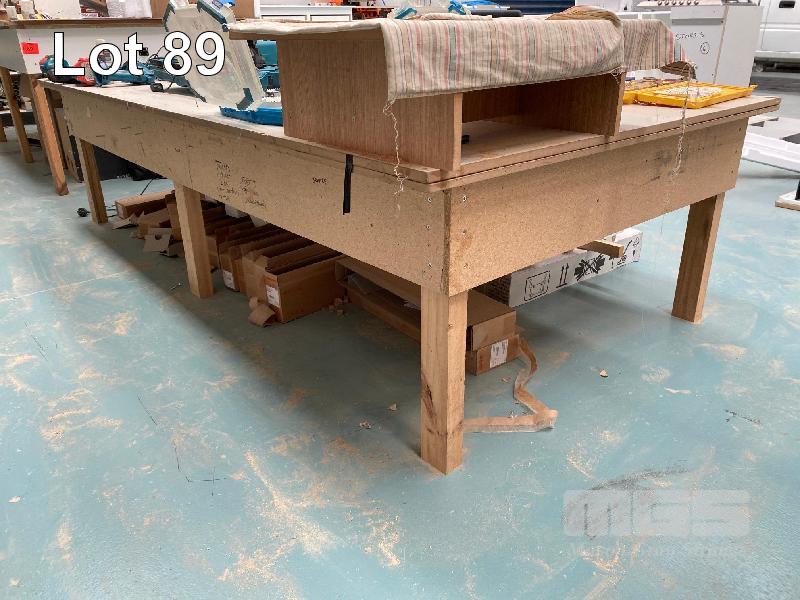 2 x TIMBER WORK BENCHES, 2460 (L) x 1200 (W) x 850mm (H) & 2460 (L) x 1200 (W) x 620mm (H)