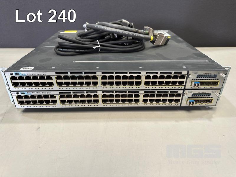 2 x CISCO CATALYST 3750-X SERIES 48-PORT SWITCHES, WS-C3750X-48P-S V05 EACH WITH C3KX-NM-1G NETWORK MODULE, STACK CABLES & IEC-C15 NOTCH POWER CABLES S/N:FDO1741R2B1, FDO1742R0HH