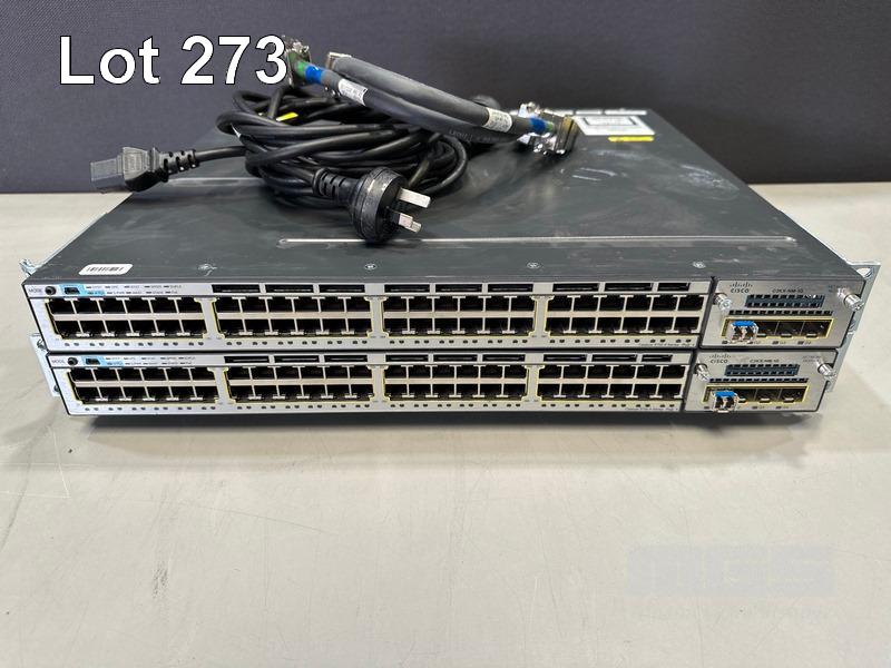 2 x CISCO CATALYST 3750-X SERIES 48-PORT SWITCHES, WS-C3750X-48P-S V05 EACH WITH C3KX-NM-1G NETWORK MODULE, STACK CABLES & IEC-C15 NOTCH POWER CABLES S/N:FDO1723Z09T, FDO1741R2AF
