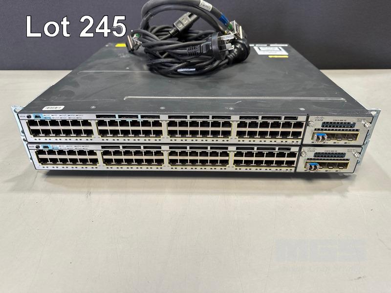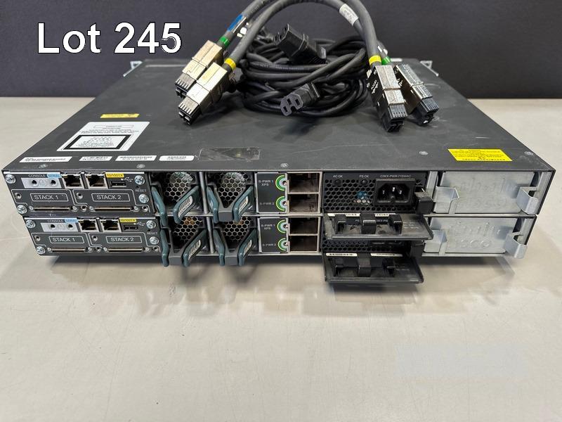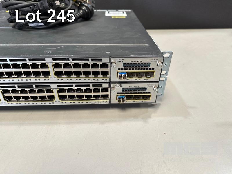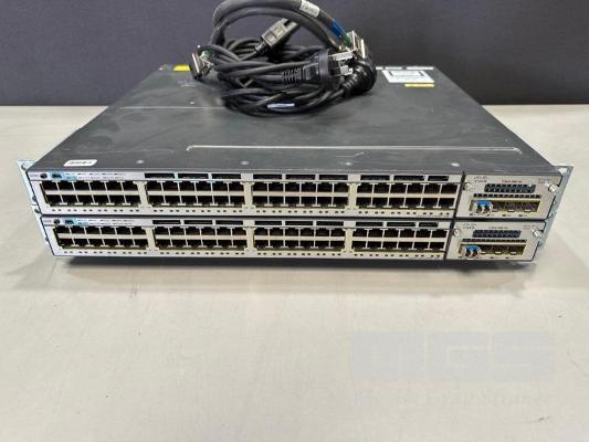2 x CISCO CATALYST 3750-X SERIES 48-PORT SWITCHES, WS-C3750X-48P-S V03 & V04 EACH WITH C3KX-NM-1G NETWORK MODULE, STACK CABLES & IEC-C15 NOTCH POWER CABLES S/N:FDO1636P0UF, FDO1649Z2GU