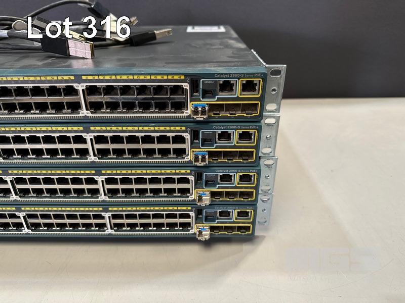 4 x CISCO CATALYST 2960-S SERIES PoE+ 48-PORT SWITCHES, WS-C2960S-48LPS-L V04 WITH C2960S-STACK MODULES & STACKING CABLES S/N:FOC1746YA0K, FOC1741Z12C, FOC1739W04Y, FOC1737Z357