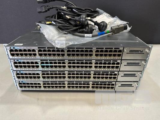 4 x CISCO CATALYST 3750-X SERIES 48-PORT SWITCHES, WS-C3750X-48P-S V05 EACH WITH STACK CABLES & IEC-C15 NOTCH POWER CABLES S/N:FDO1745P009, FDO1741R2AB, FDO1741R2B7, FDO1741R29P