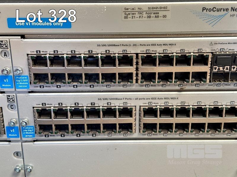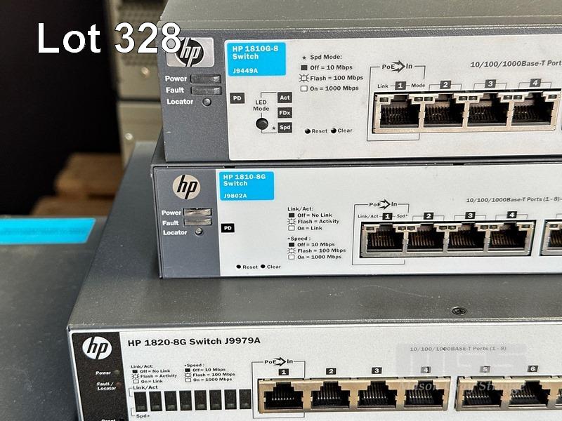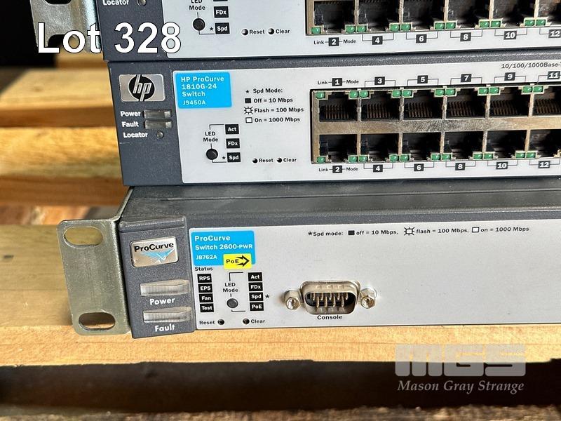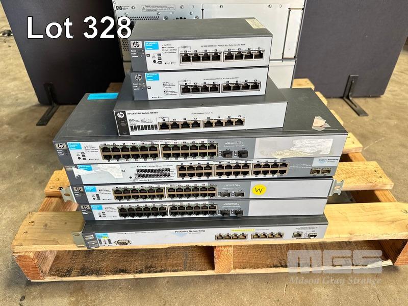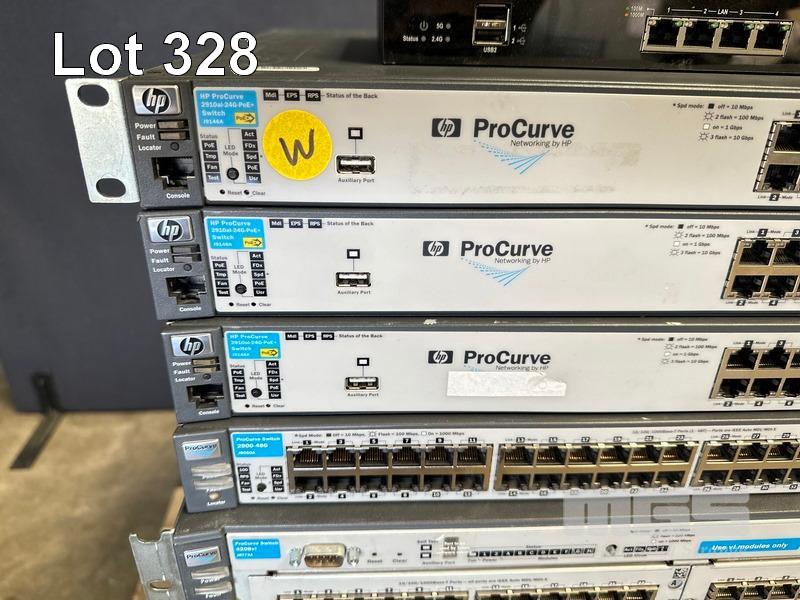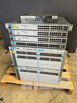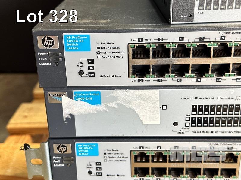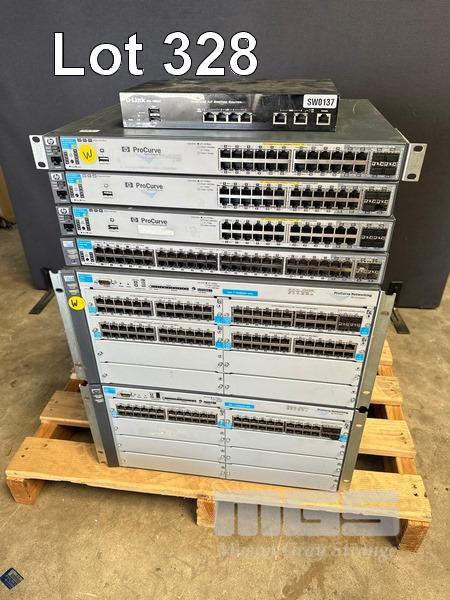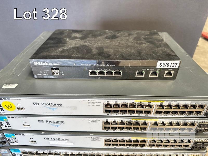 1 x D-LINK DSR-1000AC WIRELESS AC SERVICE ROUTER 3 x HP PROCURVE 2910al-24G-PoE+ SWITCH, J9146A 1 x HP PROCURVE 2900-48G SWITCH, J9050A 2 x HP PROCURVE 4208vl SWITCH, J8773A 1 x HP 1810G-8 SWITCH, J9449A 1 x HP 1810-8G SWITCH, J9802A 3 x HP PROCURVE 1810-24 SWITCH, J9450A 1 x HP PROCURVE 2600-PWR SWITCH, J8762A (NO CABLES, NO POWER SUPPLIES)