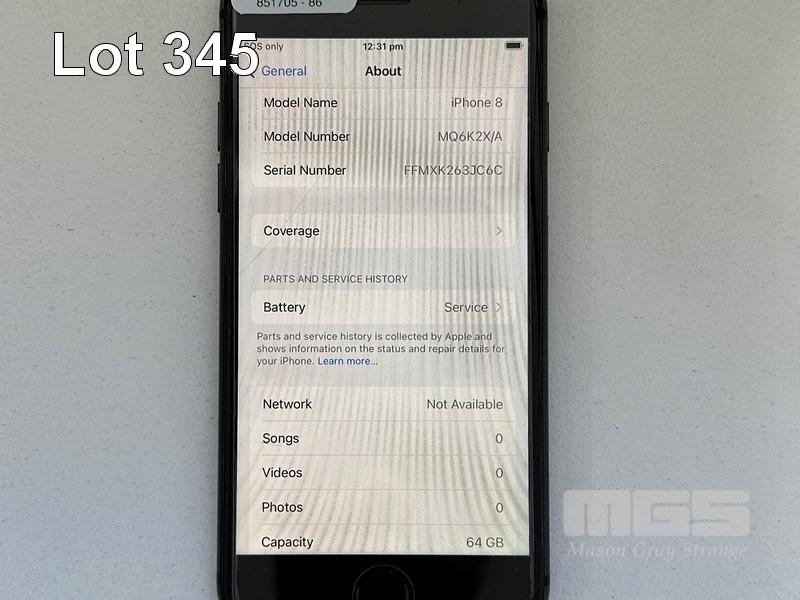 APPLE iPHONE 8, 64GB, SPACE GREY, MODEL MQ6K2X/A (NO CABLE, NO CHARGER) (NOTE: BATTERY SERVICE MESSAGE) S/N:FFMXK263JC6C