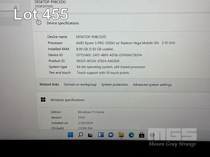 LAPTOP, LENOVO THINKPAD T495s, TYPE 20QK, AMD RYZEN 5 PRO 3500U WITH RADEON VEGA MOBILE GFX @ 2.1GHz, 8GB DDR4 RAM, 256GB NVMe M.2 SSD, 14" TOUCHSCREEN (1920x1080), Wi-Fi, BLUETOOTH, WINDOWS 11 HOME INSTALLED (NO USB-C POWER SUPPLY) (NOTE: MARKS ON SCREEN) S/N:PC1AY2PV