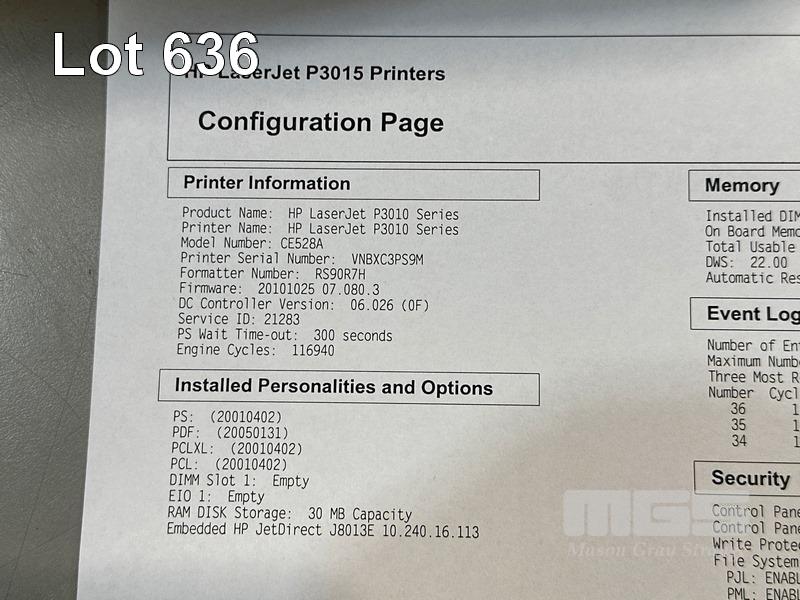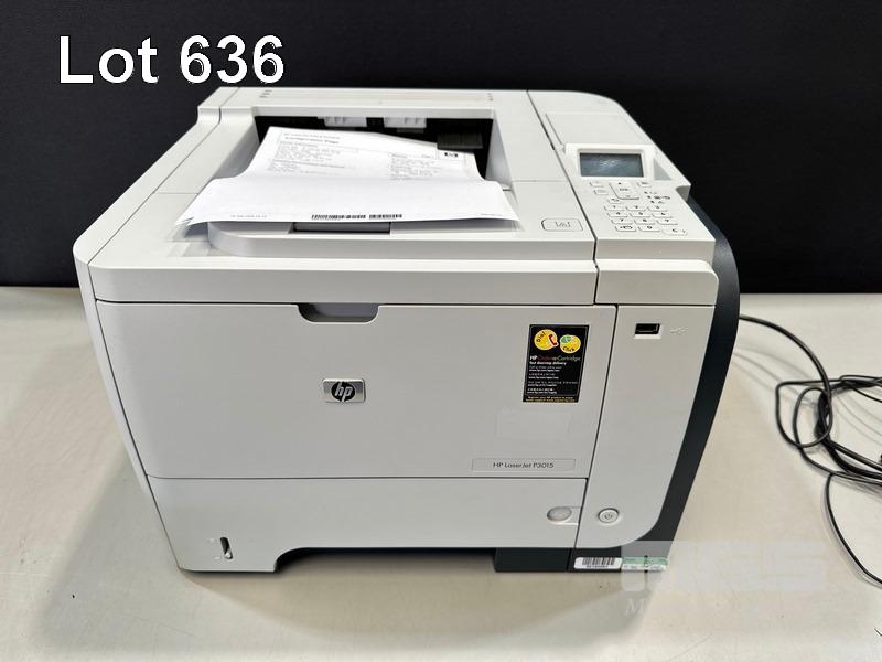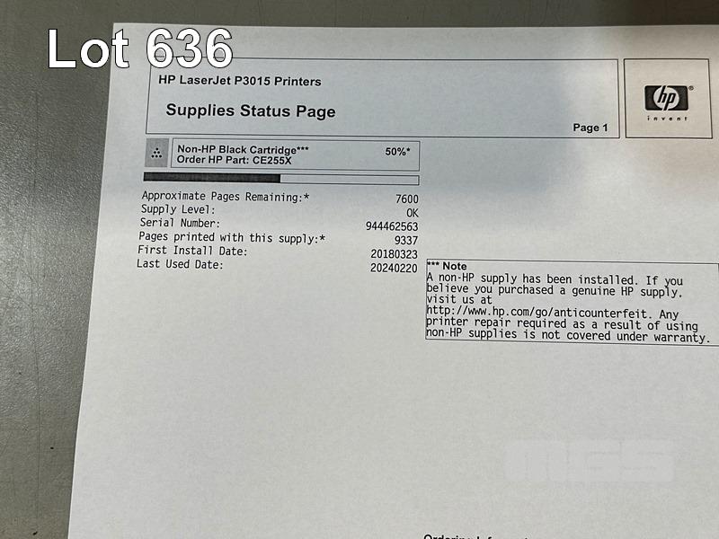 PRINTER, HP LASERJET P3015, 116,940 PAGES (TEST PAGE ATTACHED)