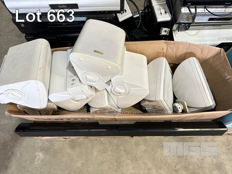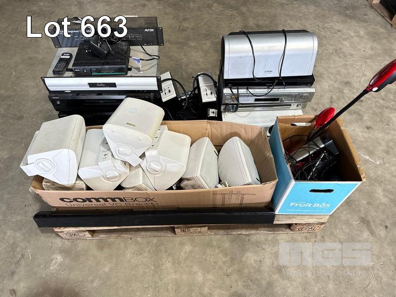 1 x PALLET LOT ASST AV INCLUDING AUSTRALIAN MONITOR SPEAKERS, BLU-RAY PLAYERS (NO REMOTES), TDK SPEAKER SYSTEM, SOUNDBAR, SONY CD CHANGER & CASSETTE DESK