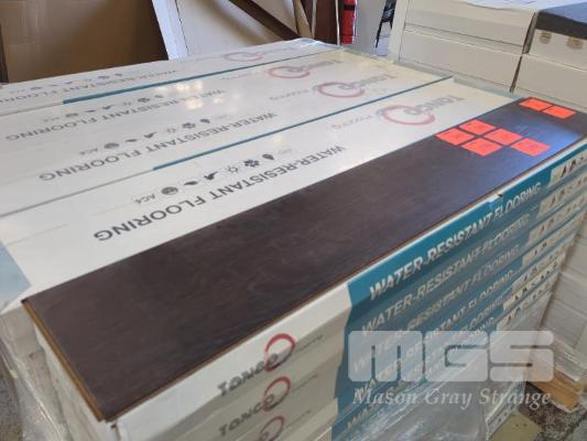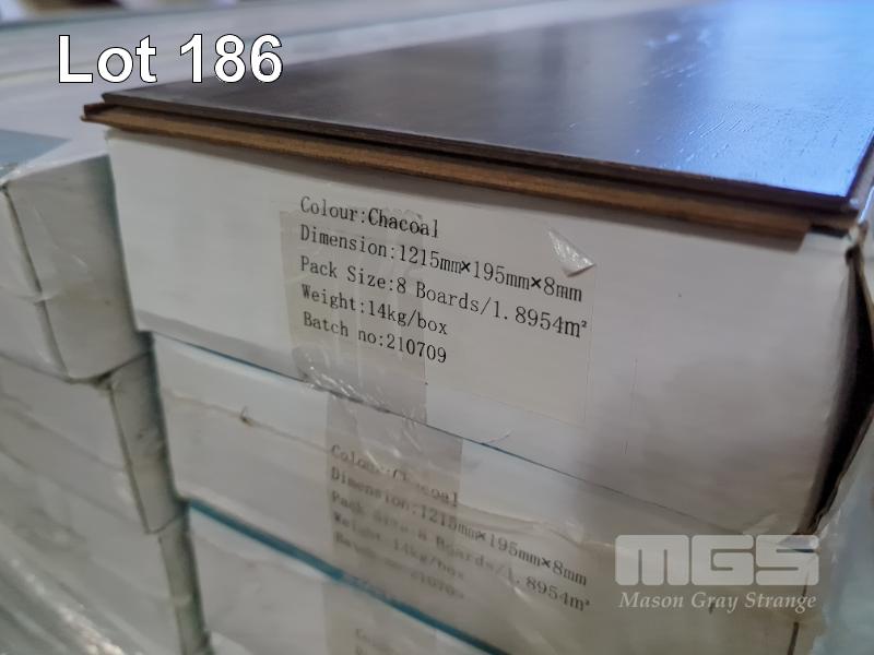 10 PACKS OF 8.0 MM WATER-RESISTANT LAMINATE FLOORING IN COLOUR CHARCOAL. SIZE 1,215 X 195 X 8 MM (W D H). 1.895 M2 PER BOX. 18.95 M2 TOTAL. ALL NEW PACKS.