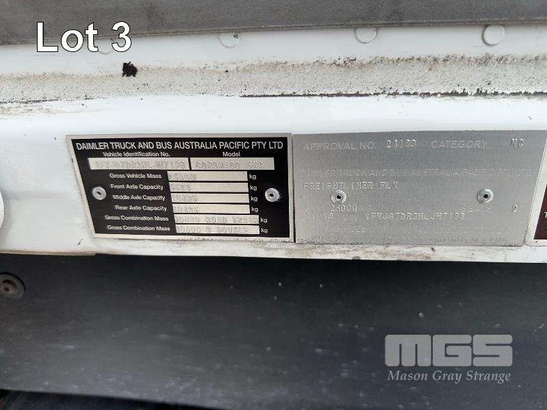 2018 FREIGHTLINER PRIME MOVER 114 MOD: FLX CORONDO 6x4 REG: XS 60 BS VIN: 1FVJG7DR3HLJH7198 ODO: 208,957kms SHOWING DETROIT 6 CYLINDER, EATON 18 SPEED, AIRBAG DAY CAB, ALLOYS, GCM: ROAD TRAIN: 90,000kg GCM: B DOUBLE 80,000kg PAPERS 1 x KEY