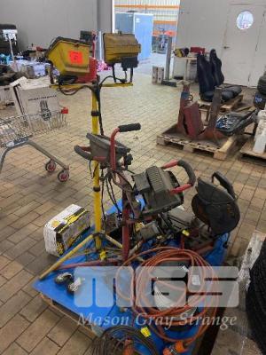 ASSORTED SHOP PORTABLE FLOOD LIGHTS, EXTENSION CORDS & 14" CUT OFF SAW, 240V