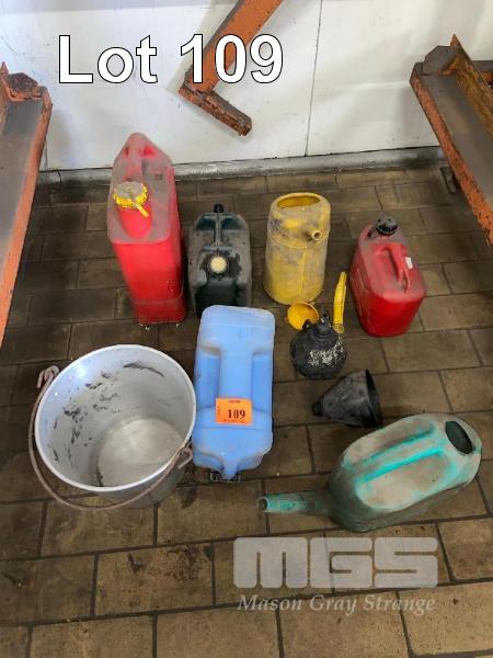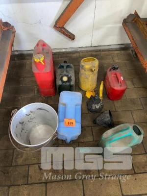 ASSORTED FUEL & WATER CONTAINERS, 5-10 LITRE, FUNNELS & ALUMINIUM BUCKET
