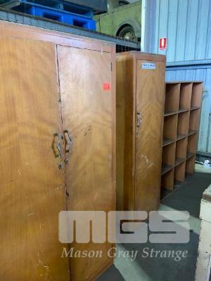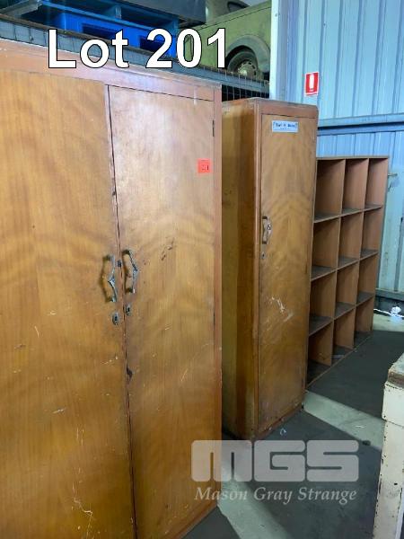 2 x TIMBER CUPBOARDS & 12 HOLE STORAGE UNIT