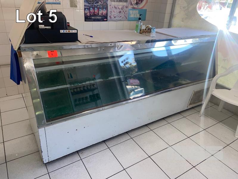 COUNTER DISPLAY FRIDGE, 2440mm SELF CONTAINED, STAINLESS STEEL CLAD, ILLUMINATED NOT WORKING