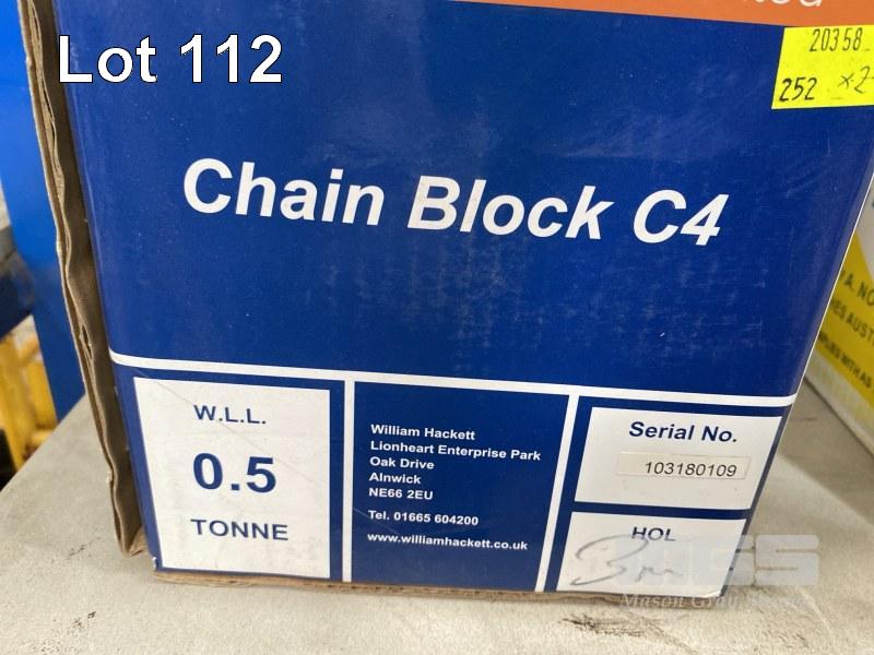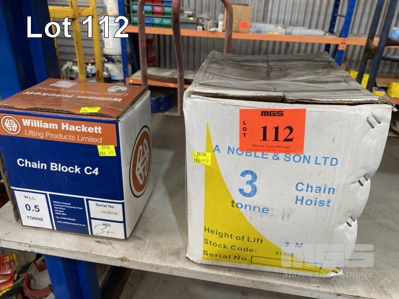 2 x CHAIN BLOCKS INC WILLIAM HACKETT C4, 500kg x 3m & NOBLE & SON, 3000kg x 3m