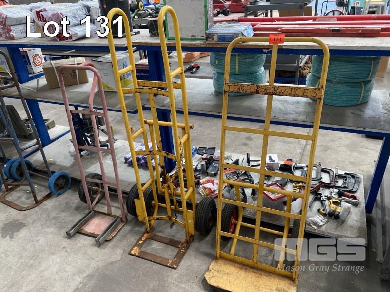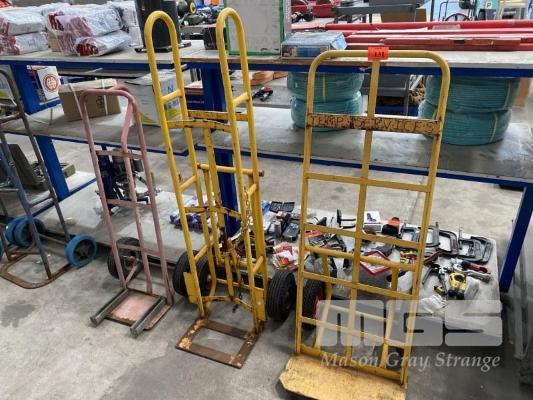 3 x SACK TROLLIES & GAS BOTTLE TROLLEY, YELLOW & RED
