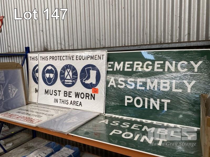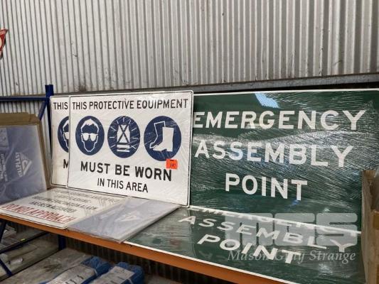 5 x ASSORTED WORK SIGNS, INC EMERGENCY ASSEMBLY POINT, PROTECTIVE EQUIPMENT MUST BE WORN, ETC