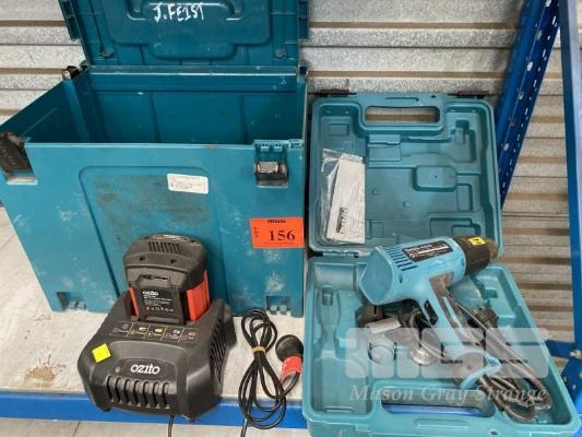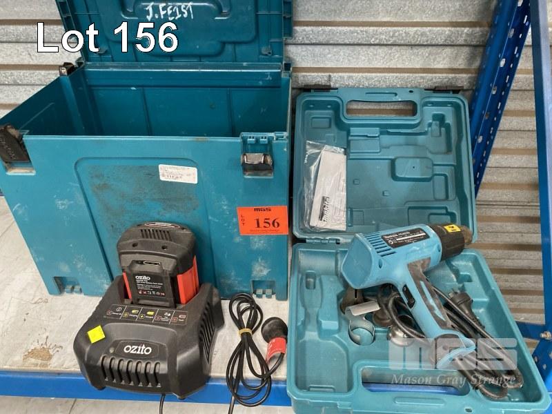 HEAT GUN, MAKITA IN CASE, BATTERY BOX & OZITO BATTERY & CHARGER