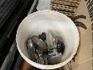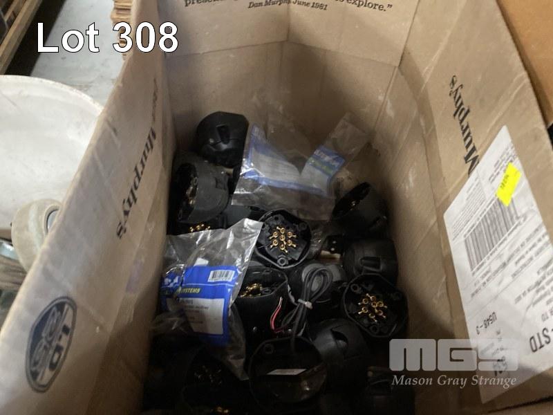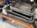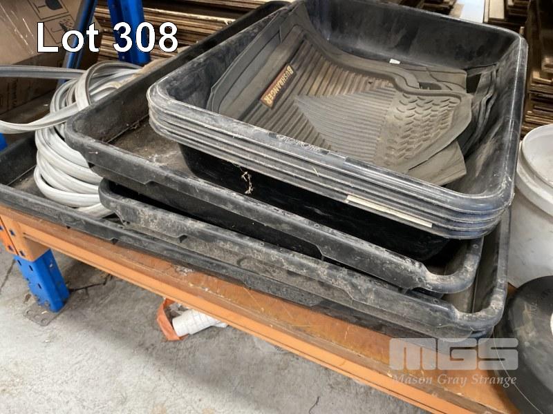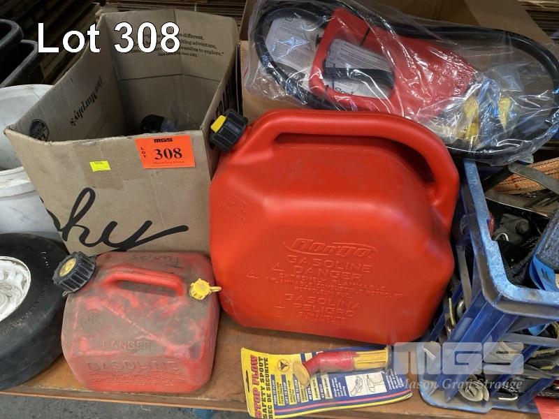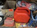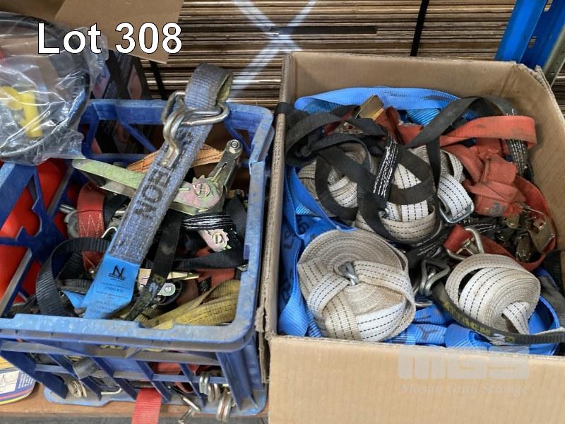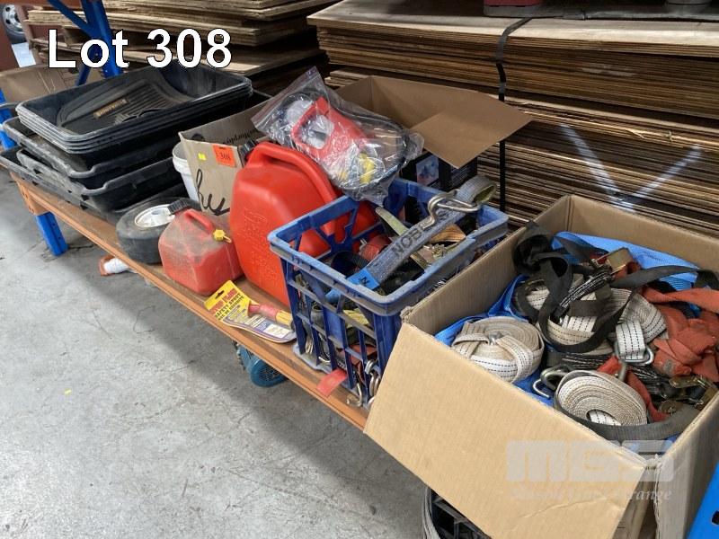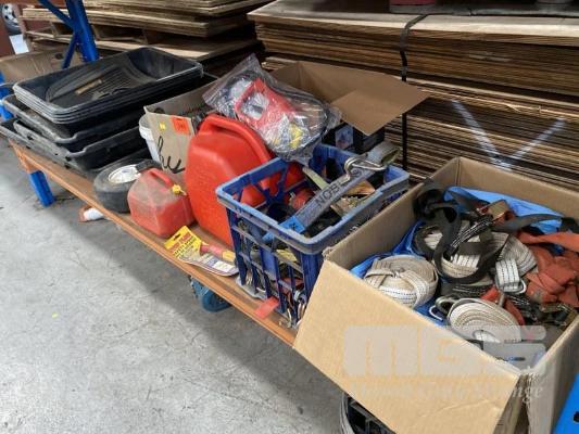LARGE QUANTITY RATCHET LOADING STRAPS, 2 x BOXES, POLY JERRY CANS, 5 & 20 LITRE, SIPHON PUMP, TRAILER CONNECTION PLUGS & LIGHTS, OIL DRIP TRAYS & TUBS, ETC