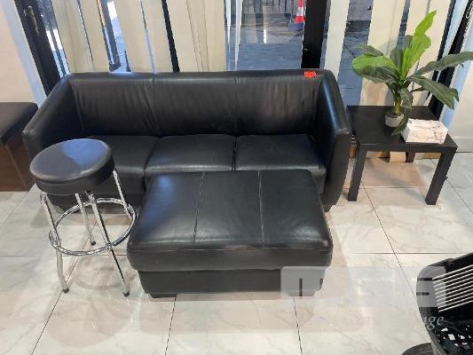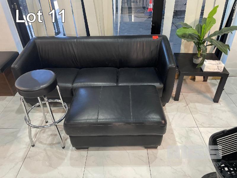 3 SEATER COUCH, BLACK VINYL, COFFEE TABLE & ORNAMENTAL PLANT