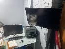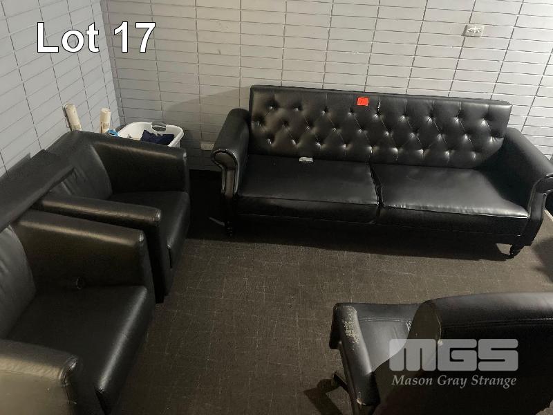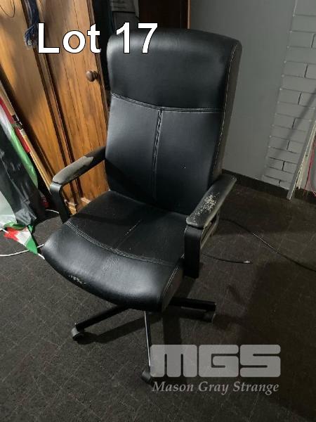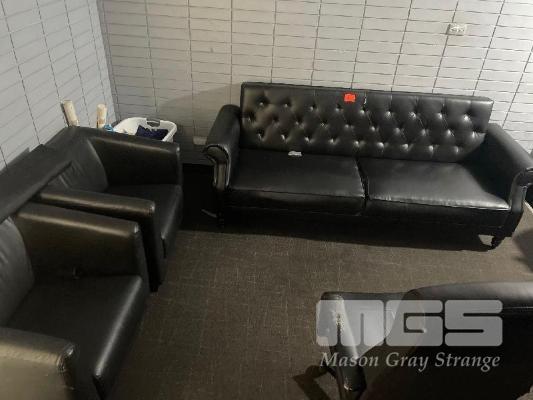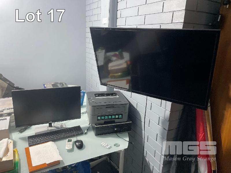 CONTENTS OF BACK ROOM INCLUDING 30" LCD TV WITH BRACKET, BROTHER PRINTER, CASH DRAWER, 22" PC MONITOR & KEYBOARD, SAFE, GLASS TOP DESK, 2 x BLACK VINYL CHAIRS, 1 x BLACK VINYL COUCH, OFFICE CHAIR & CUPBOARD