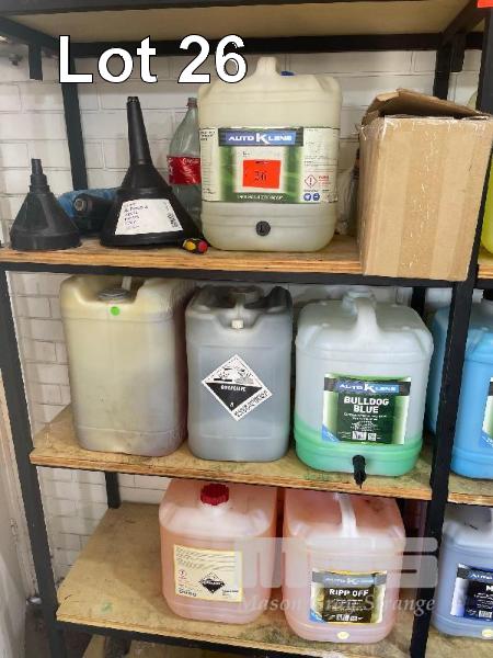 6 x PART & FULL 20 LITRE DRUMS CAR CARE PRODUCTS, SODIUM HYDROXIDE, WHEEL CLEANER, WASH, FUNNELS & CAR PARTS