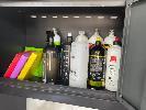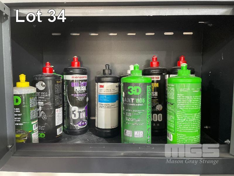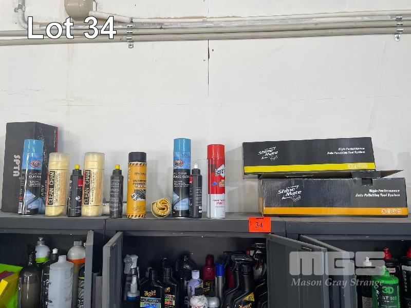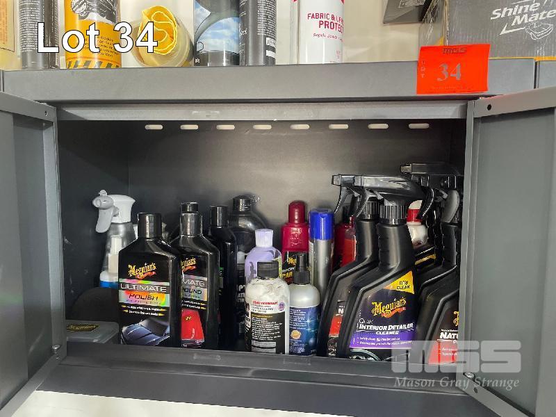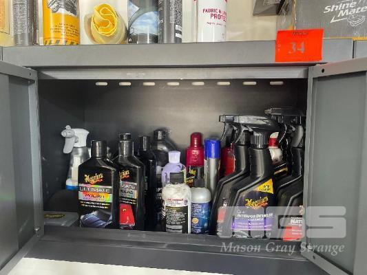 ASSORTED CAR CARE PRODUCTS, CHAMOIS, SPRAY BOTTLES, POLISHERS CONTENTS OF 6 OVERHEAD CUPBOARDS