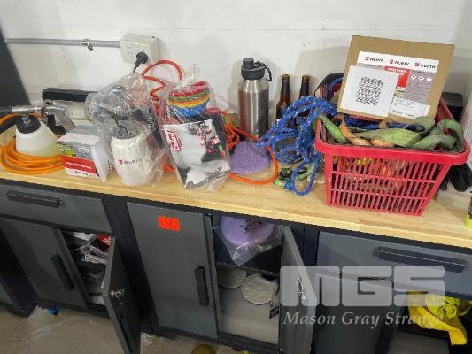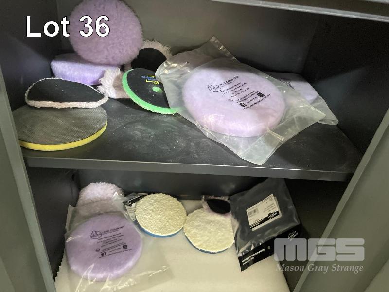 SANDING & POLISHING DISCS, BRUSHES, STOOL, SPRAY BOTTLES, LED LIGHT, ETC CONTENTS OF LOWER CUPBOARD