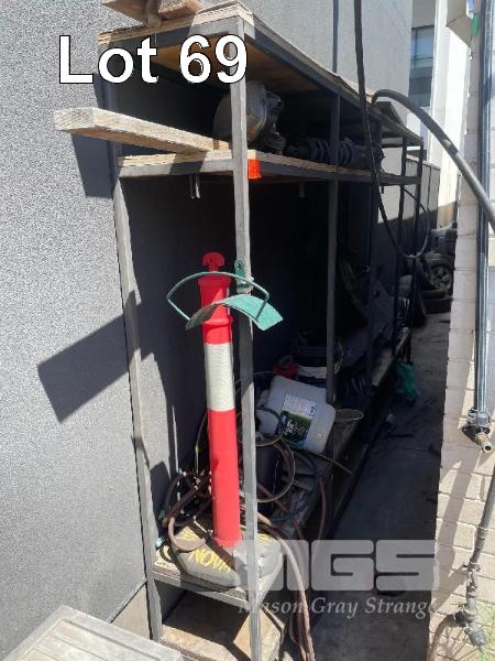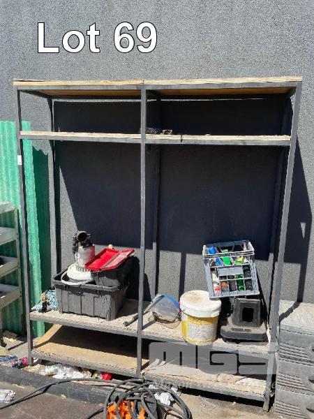 3 x STEEL FRAME SHELF RACK, PLYWOOD SHELVES, 2200 (H) x 1900 (W) x 400mm (D) & VARIOUS CAR PARTS,HOSES, TUBS, ETC