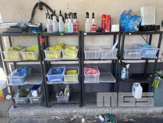 4 x PLASTIC RACKS, 4 TIER & CONTENTS CAR CARE PRODUCTS, CLEANING CLOTHS & JUMPER LEADS