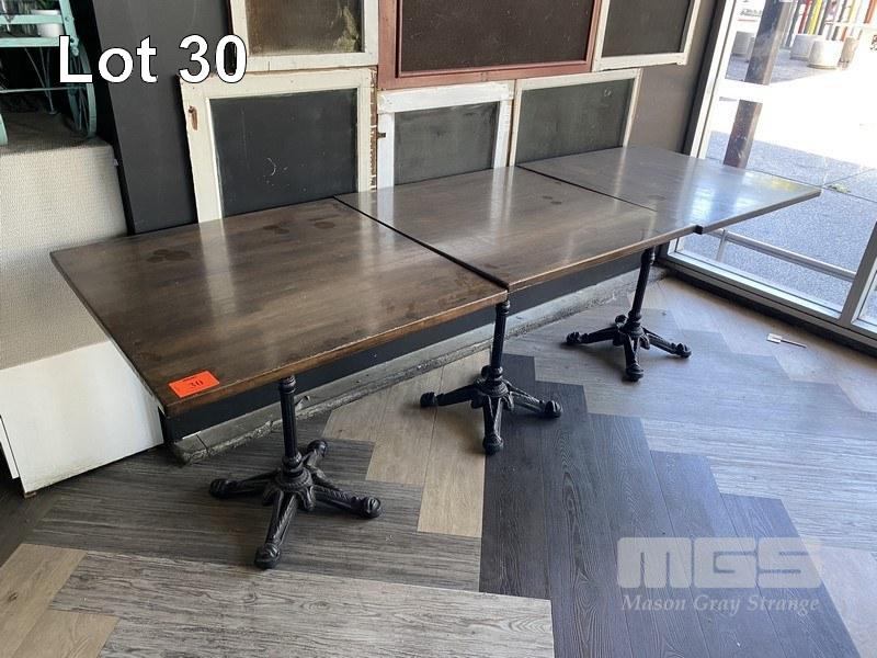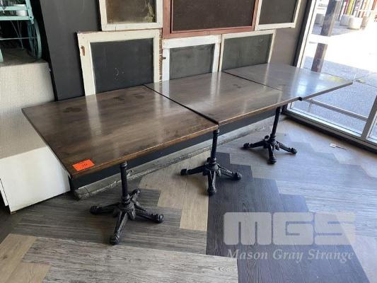 3 x CAFE TABLES, EACH 80 x 80cm, LAMINATE TOP, CAST IRON BASE