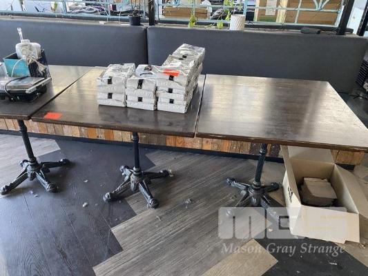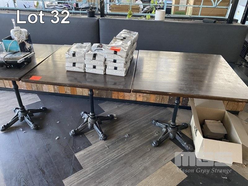 4 x CAFE TABLES, EACH 80 x 80cm, LAMINATE TOP, CAST IRON BASE