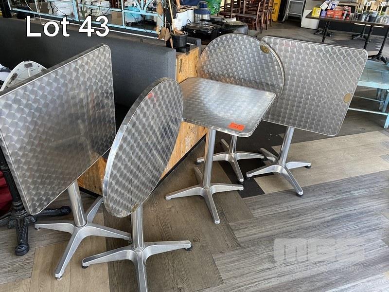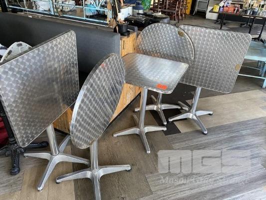 5 x FOLD DOWN ALUMINIUM OUTDOOR TABLES, 3 @ 60 x 60cm & 2 @ 60cm DIAMETER
