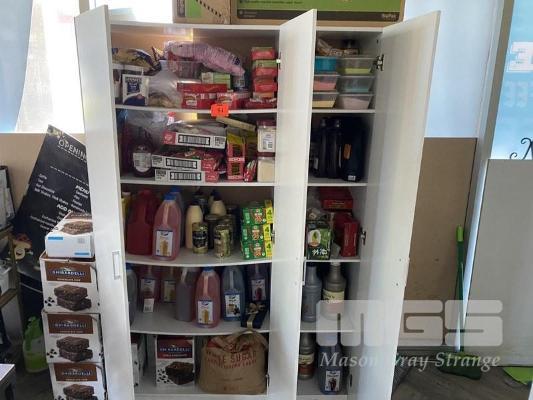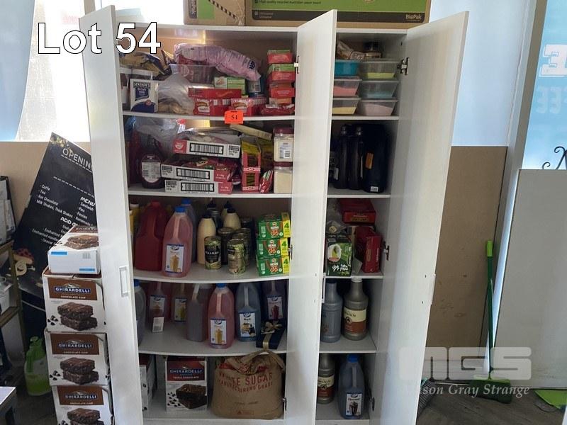 JELLY, TOPPINGS, CHOCOLATE SYRUP, SUGARS, ASSORTED TEA, CONTENTS OF CUPBOARD