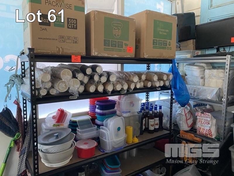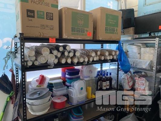 PAPER CUPS, PVC CONTAINERS, TAKEAWAY PACKAGING, ASSORTED DRINKS & FOOD STUFFS, CONTENTS 3 x RACKS