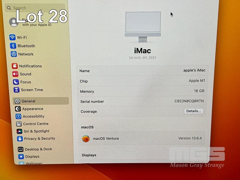 APPLE iMAC (A2438), SILVER, APPLE M1 8 CPU/8 GPU, 16GB RAM, 1TB SSD, BUILT-IN 24" RETINA DISPLAY (4480 x 2520), Wi-Fi, BLUETOOTH, MAC OS 13 INSTALLED, KEYBOARD (A2449), MOUSE (A1657) & POWER SUPPLY S/N:C02JN0CQ0RTN