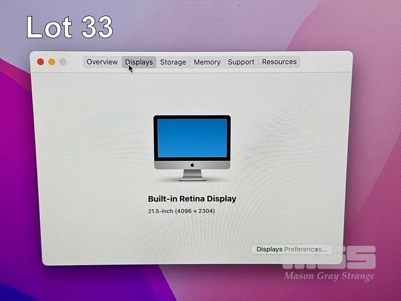 APPLE iMAC (A1418), CORE i5 7400 (7TH GEN) @ 3GHz, 8GB DDR4 RAM, 512GB SSD, BUILT-IN 21.5" RETINA DISPLAY (4096x2304), 2GB RADEON PRO 555 VIDEO, Wi-Fi, BLUETOOTH, MAC OS 12 INSTALLED (NO KEYBOARD, NO MOUSE) S/N:C02WV09KJ1G9
