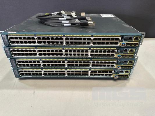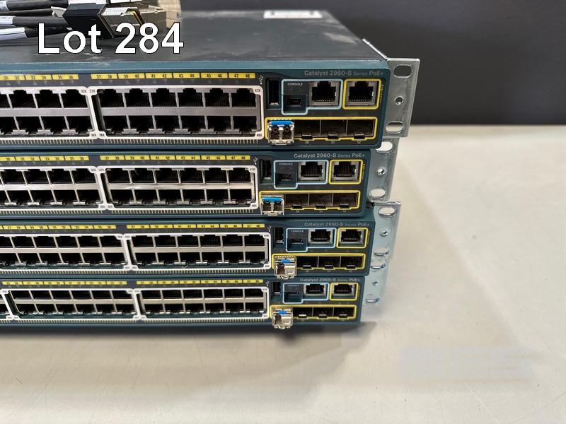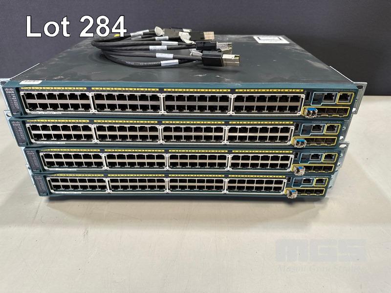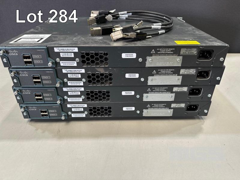 4 x CISCO CATALYST 2960-S SERIES PoE+ 48-PORT SWITCHES, WS-C2960S-48LPS-L V04 WITH C2960S-STACK MODULES & STACKING CABLES S/N:FOC1803V3F9, FOC1739W056, FOC1737Z2XD, FOC1741Z12G
