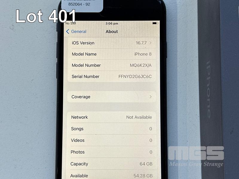 APPLE iPHONE 8, 64GB, SPACE GREY, MODEL MQ6K2X/A, BATTERY HEALTH 85% (NO CABLE, NO CHARGER) S/N:FFNYD2G6JC6C