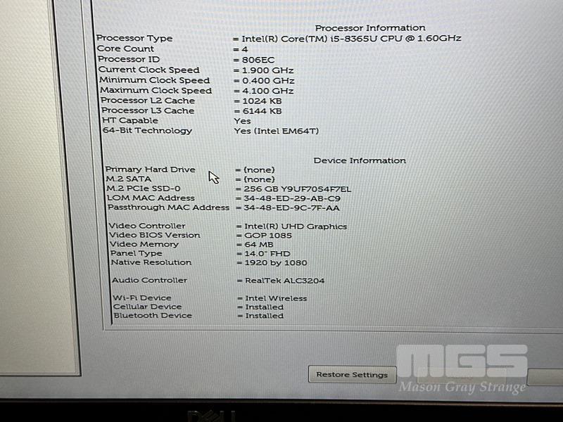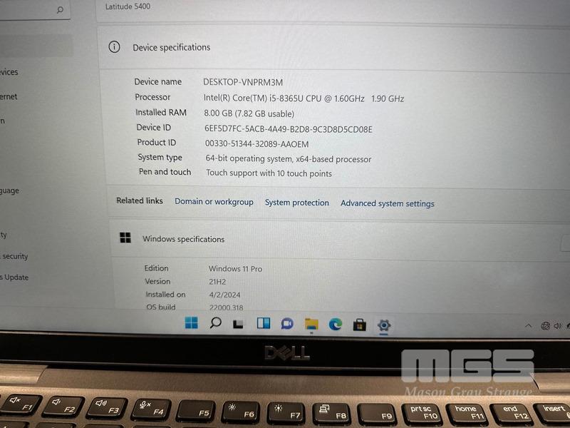 LAPTOP, DELL LATITUDE 5400, CORE i5 8365U (8TH GEN) @ 1.6GHz, 8GB DDR4 RAM, 256GB NVMe M.2 SSD, 14" WIDESCREEN (1920x1080), INTEL UHD GRAPHICS 620, Wi-Fi, CELLULAR, BLUETOOTH, WINDOWS 11 PRO INSTALLED & POWER SUPPLY (NOTE: BRIGHT SPOT ON SCREEN) S/N:9GCKL13
