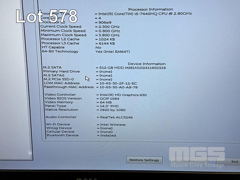 LAPTOP, DELL LATITUDE 5480, CORE i5 7440HQ (7TH GEN) @ 2.8GHz, 8GB DDR4 RAM, 512GB M.2 SSD, 14" WIDESCREEN (1920x1080), INTEL HD GRAPHICS 630, Wi-Fi, BLUETOOTH, WINDOWS 10 HOME INSTALLED & POWER SUPPLY (NOTE: BRIGHT SPOT ON SCREEN) S/N:1PMGQN2