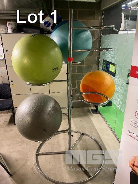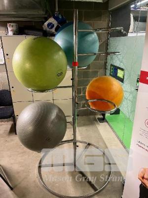 4 x INFLATABLE GYM BALLS, WITH CHROME 8 BALL RACK