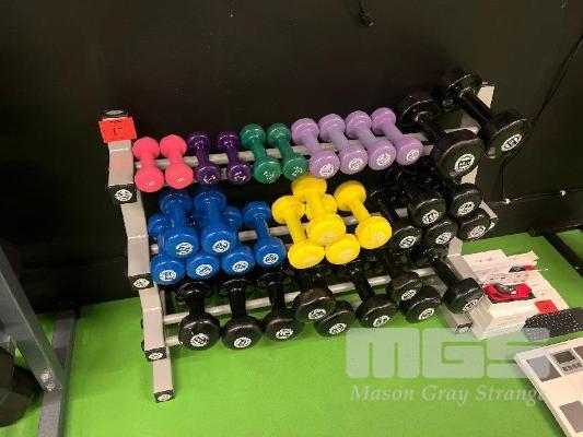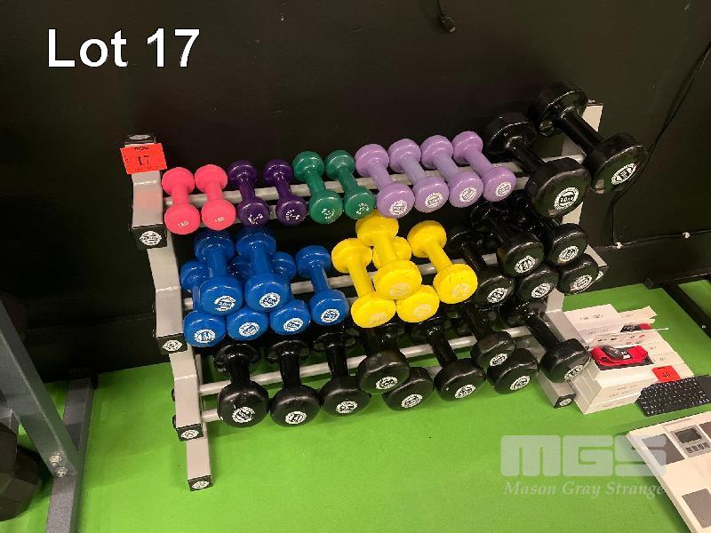 36 x DUMBBELLS, RUBBER COATED, AUSTRALIAN BAR COMPANY & 3 TIER RACK 1-10kg