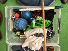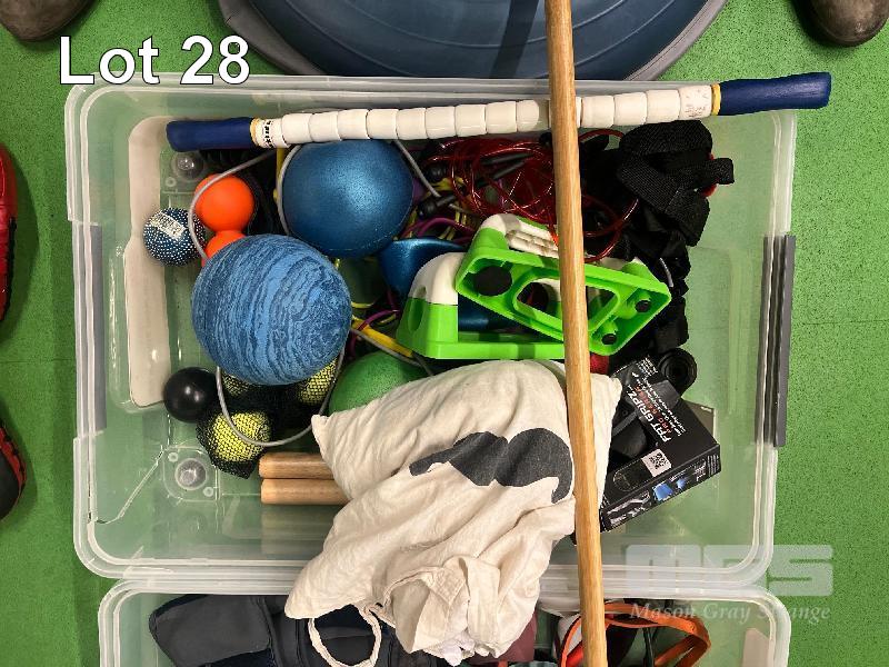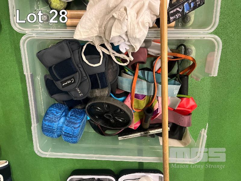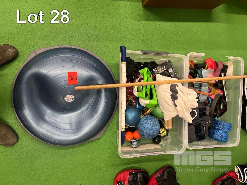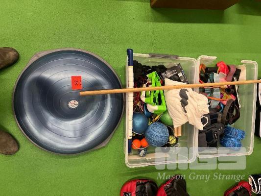INFLATABLE BALANCE BALL, 2 x TUBS ASSORTED GYM EQUIPMENT, STRETCH STRAPS, FLOOR PULLER, SKIPPING ROPES, ETC