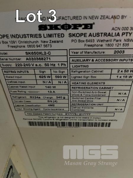 SINGLE DOOR DRINKS FRIDGE, SKOPE MOD: SK650XL2-C DOM: 2003 650 LITRE APPROX TOP MOUNT COMPRESSOR TESTED, 2200 (H) x 740mm (W)